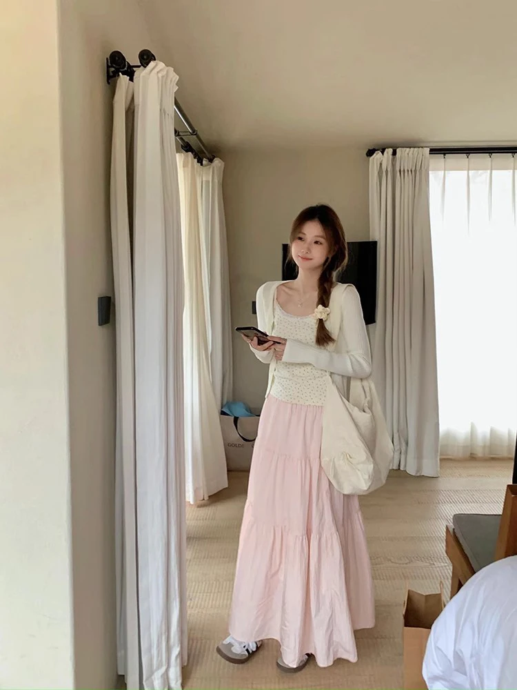 vmtvr Summer Chic Pink Long Skirts for Women 2024 New Elegant A Line Cake Skirt Woman Korean Fashion Casual Midi Skirt