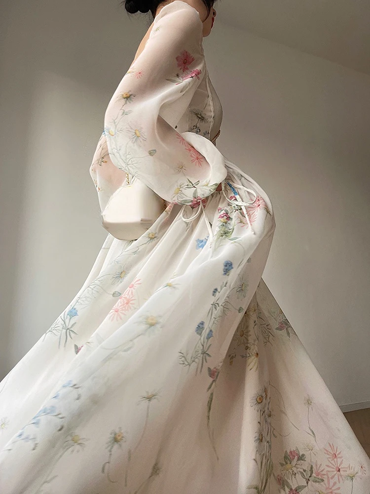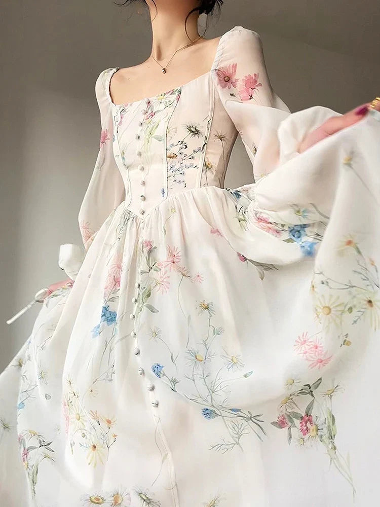 vmtvr Summer French Floral Midi Dress Elegant Chiffon Long Sleeve Party Dress Woman Beach Evening Fairy One Piece Dress Korean