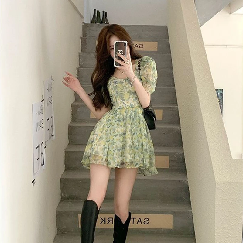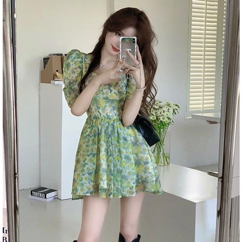 vmtvr Summer High Waist Dress Women Korean Fashion Floral Casual Mini Dresses Y2K Female Elegant Puff Sleeve A Line Dress