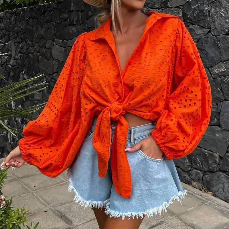 vmtvr Summer Hollow Lace Embroidered Shirt Casual Turn-down Collar Lace Up Solid Color Top Women Fashion Lantern Sleeves Beach Blouses