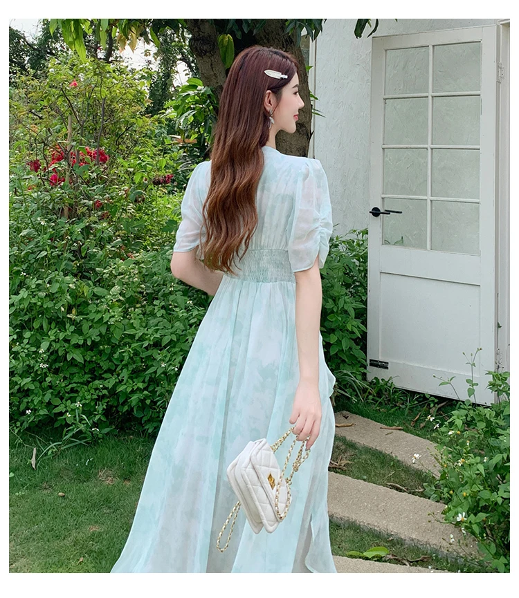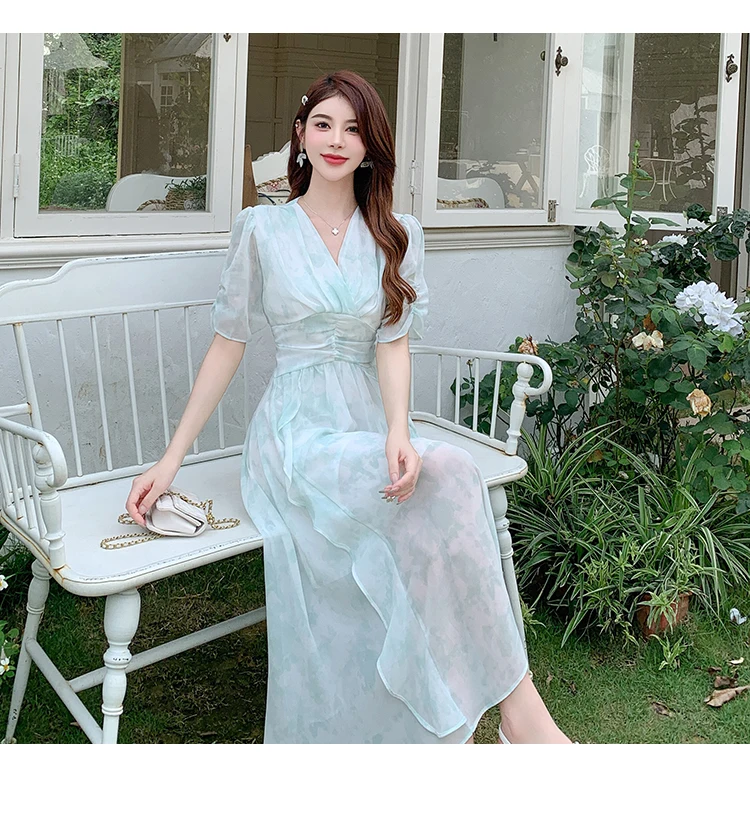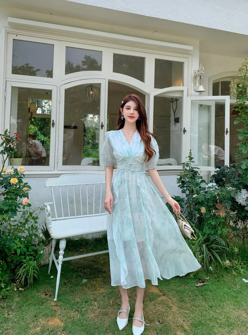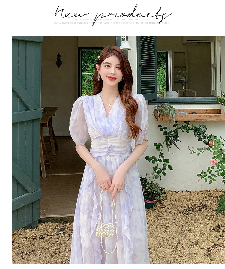 vmtvr Summer Vintage Women Elegant Print Dresses 2024 New Sweet Gentle Puff Sleeve Flounced Edge Long Sundress Holiday Beach Dress