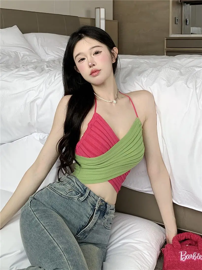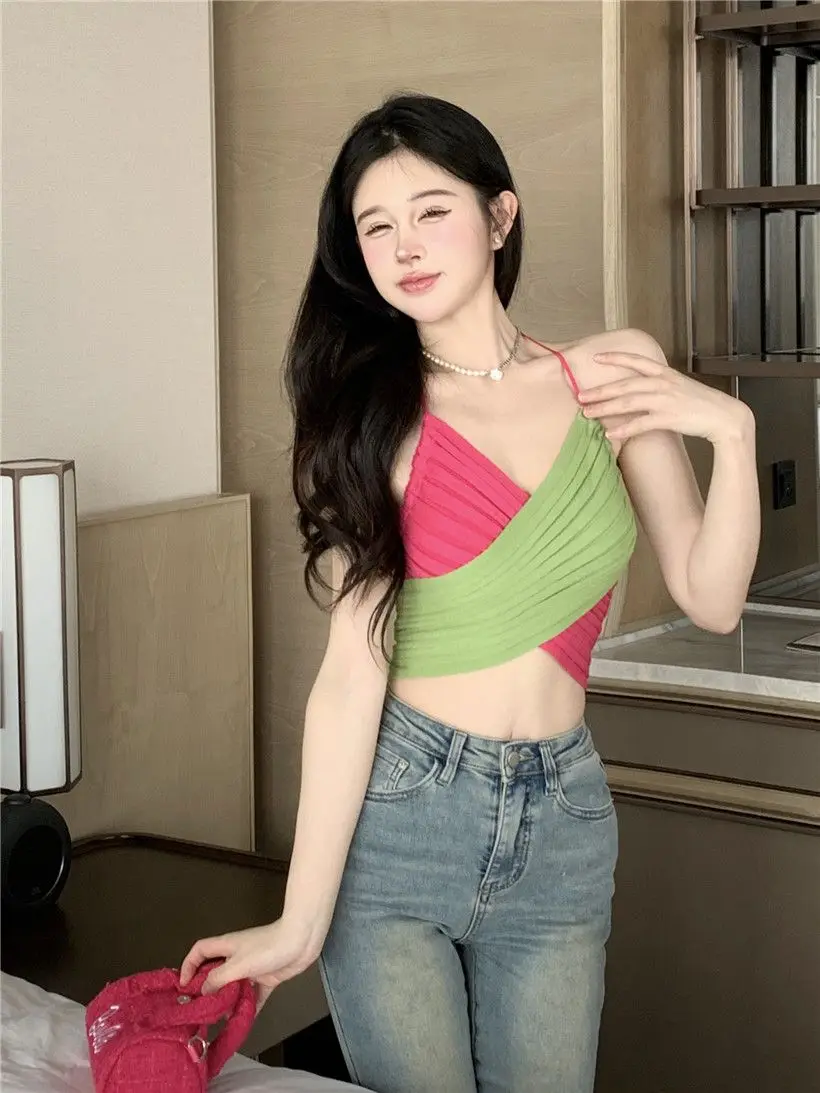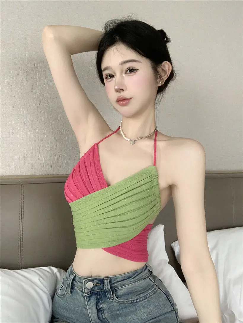 vmtvr Summer Women Sexy Cross Halter Knitting Camis New Fashion Female Clothing Black White Contrast Sweet Short Crop Top Tanks