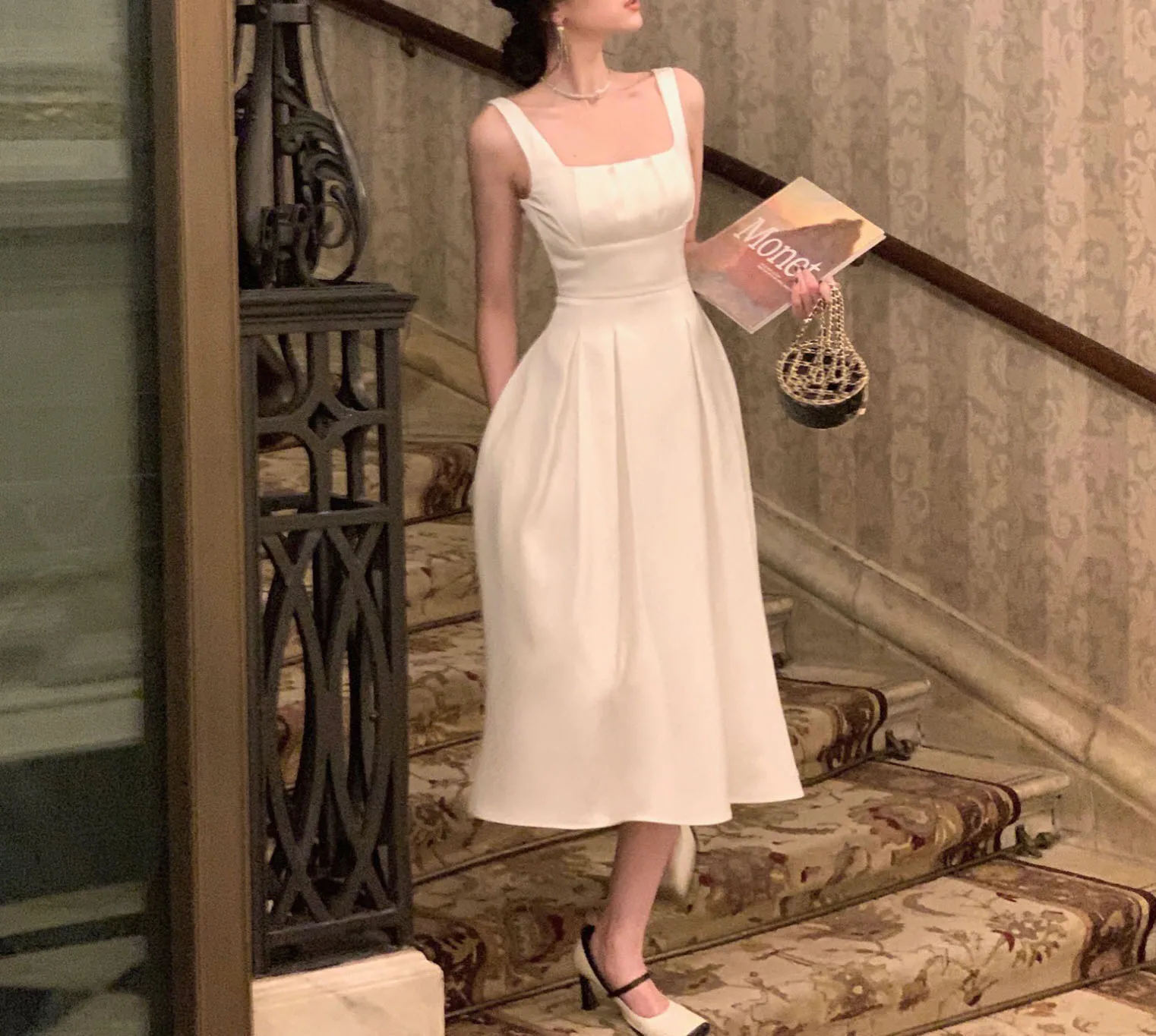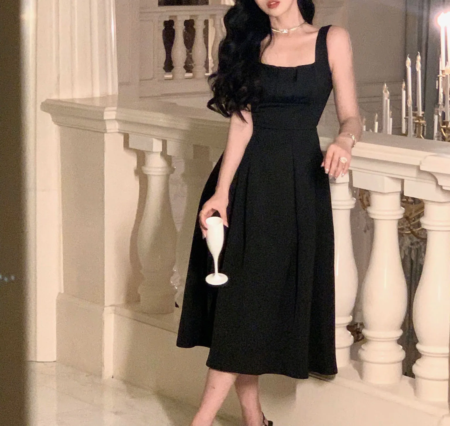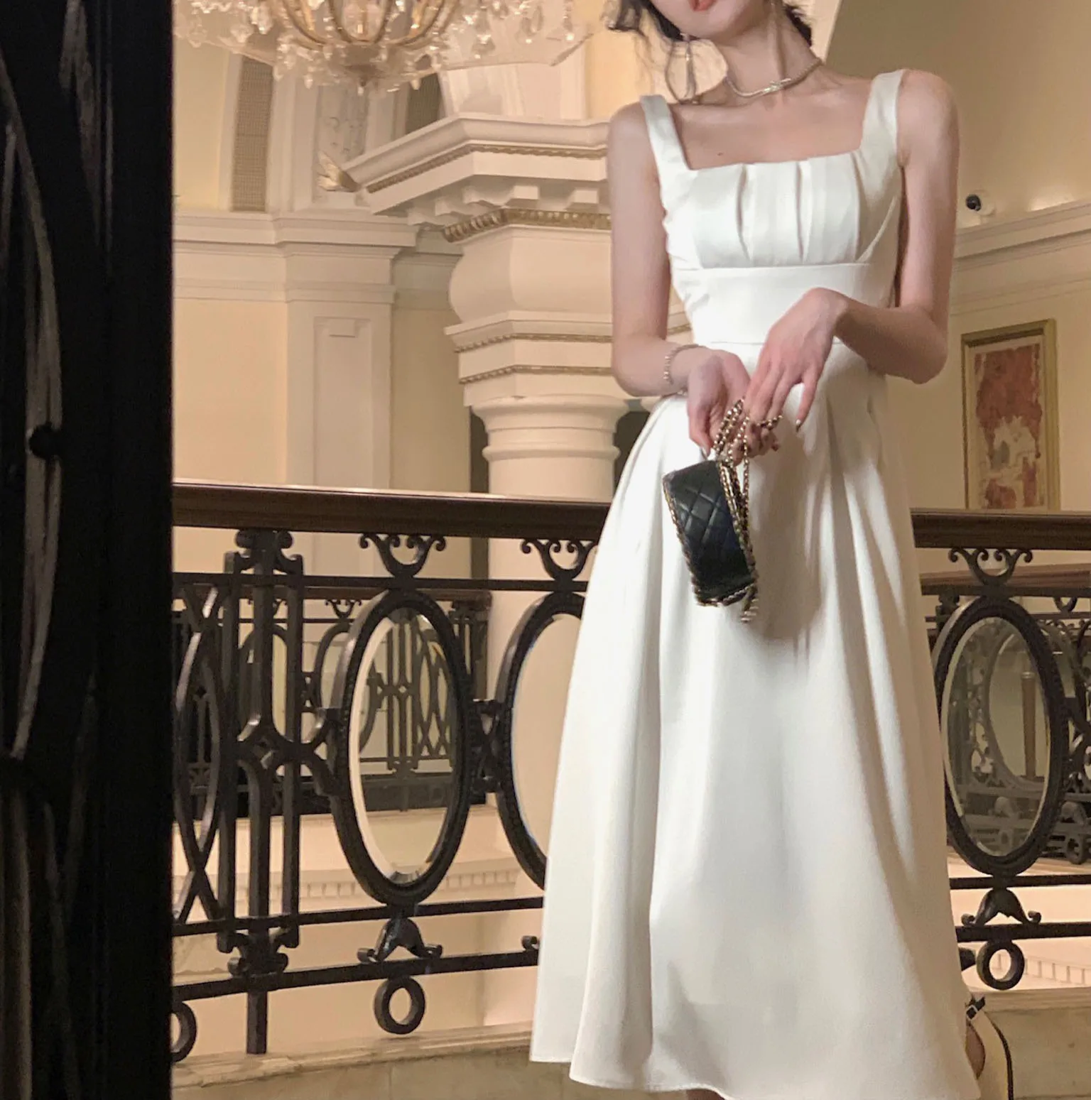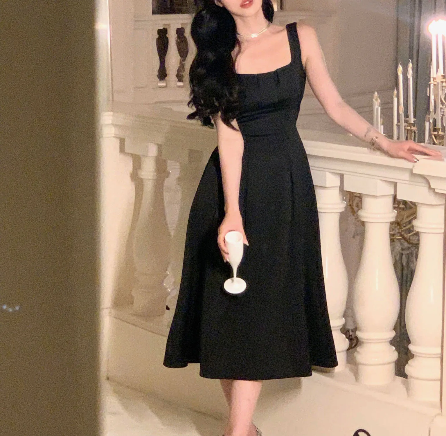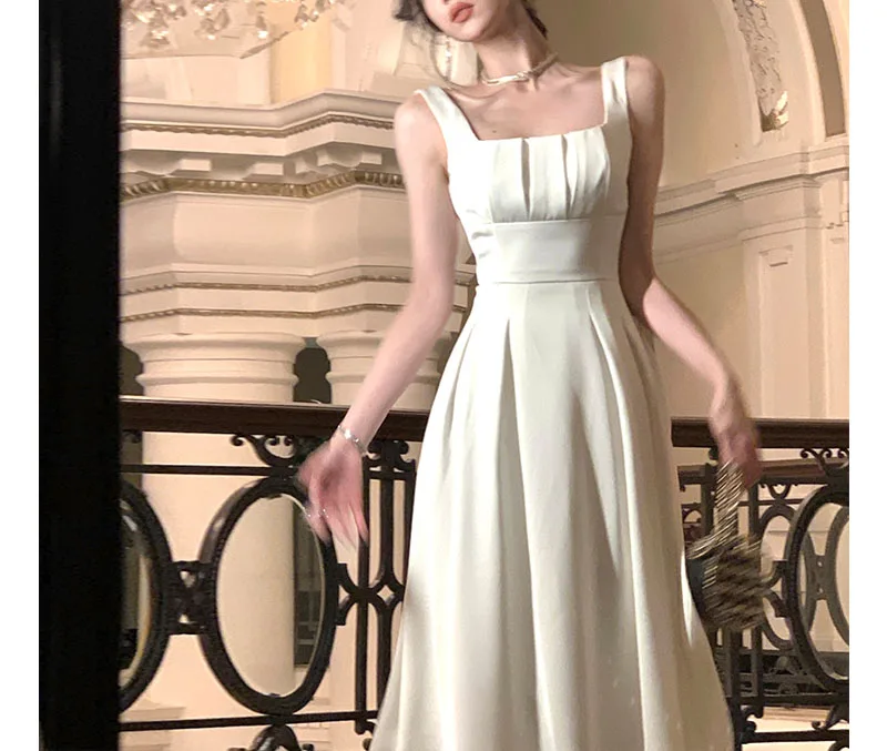 vmtvr Vintage Elegant Dress for Women Sleeveless Square Collar Spaghetti Strap Fashion Party Evening French Dress New Summer