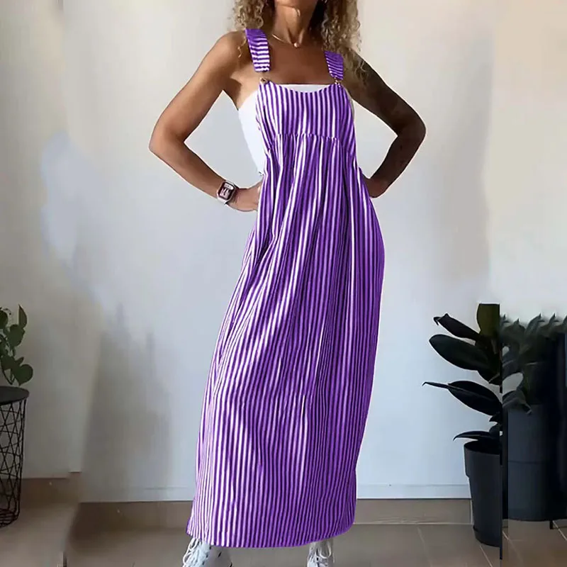 vmtvr Vintage Striped Print Sleeveelss Suspender Dress Summer Casual Pocket Loose Party Dress 2024 Women Sexy U-neck Pleat Long Dress