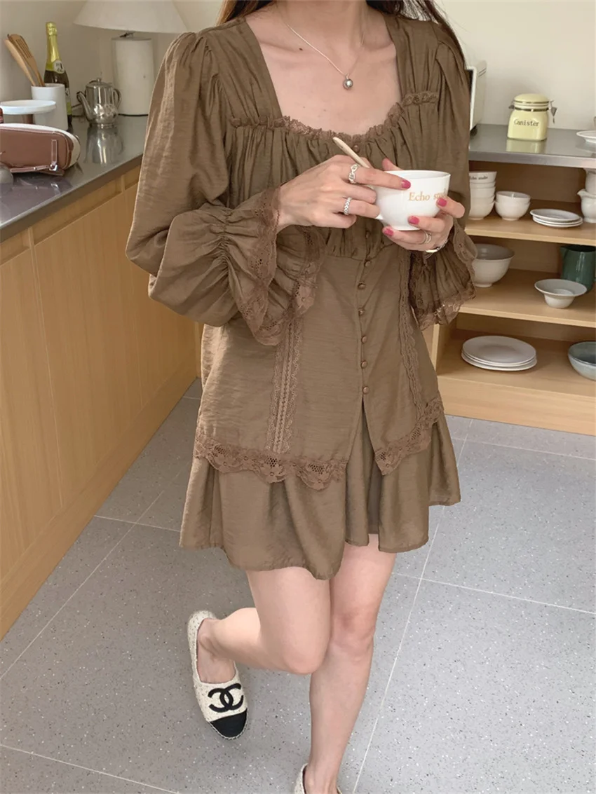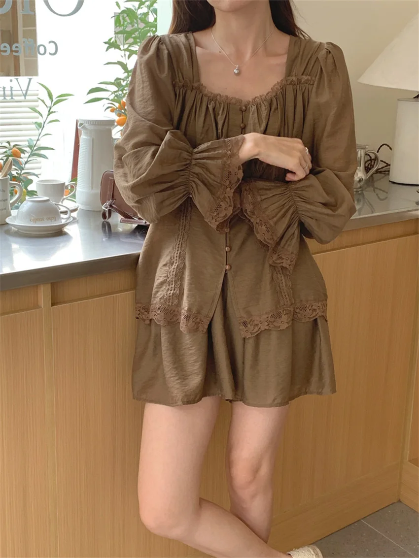 vmtvr Women Elegant Sweet Two Pieces Sets Casual High Street Summer Flare Sleeve Shirts High Waist Loose Skirts Shorts