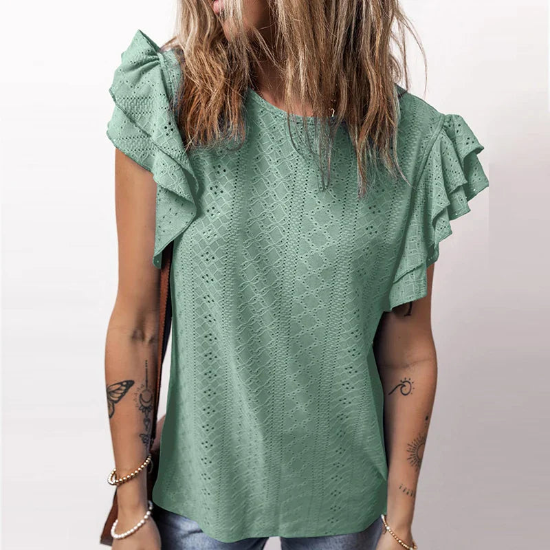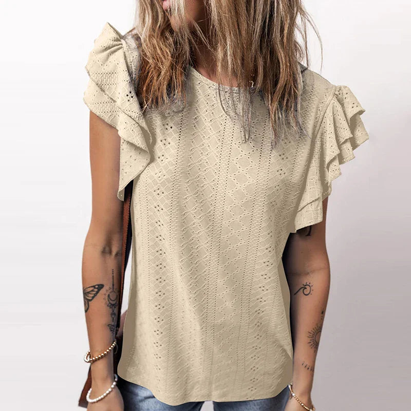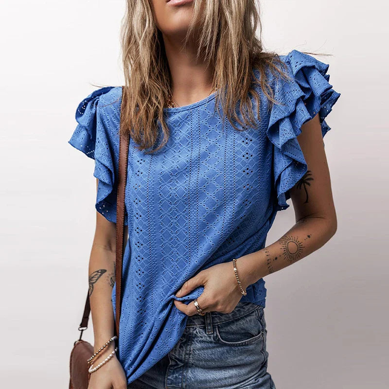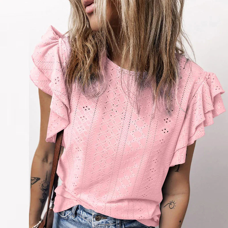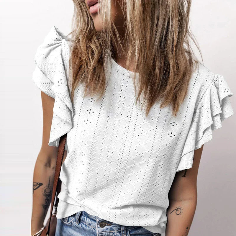vmtvr Women Sexy O Neck Crochet Lace Blouses 2024 Spring Solid Hollow Jacquad Top Pullover Summer Butterfly Short Sleeve Loose Shirts