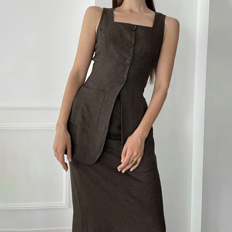 vmtvr Women's Cotton Vest Skirt Set Spring and Summer Women's Casual Office Pocket Single Row Button Top Slim Fit Loose Skirt 2Pcs