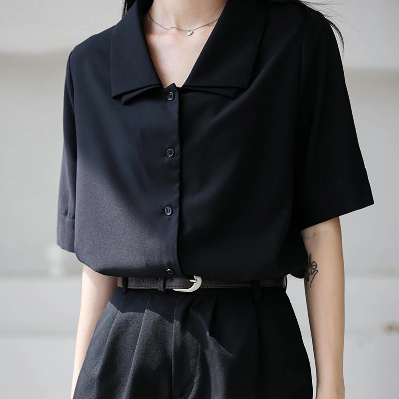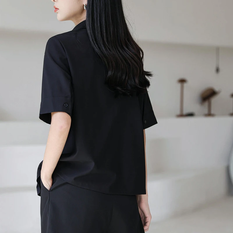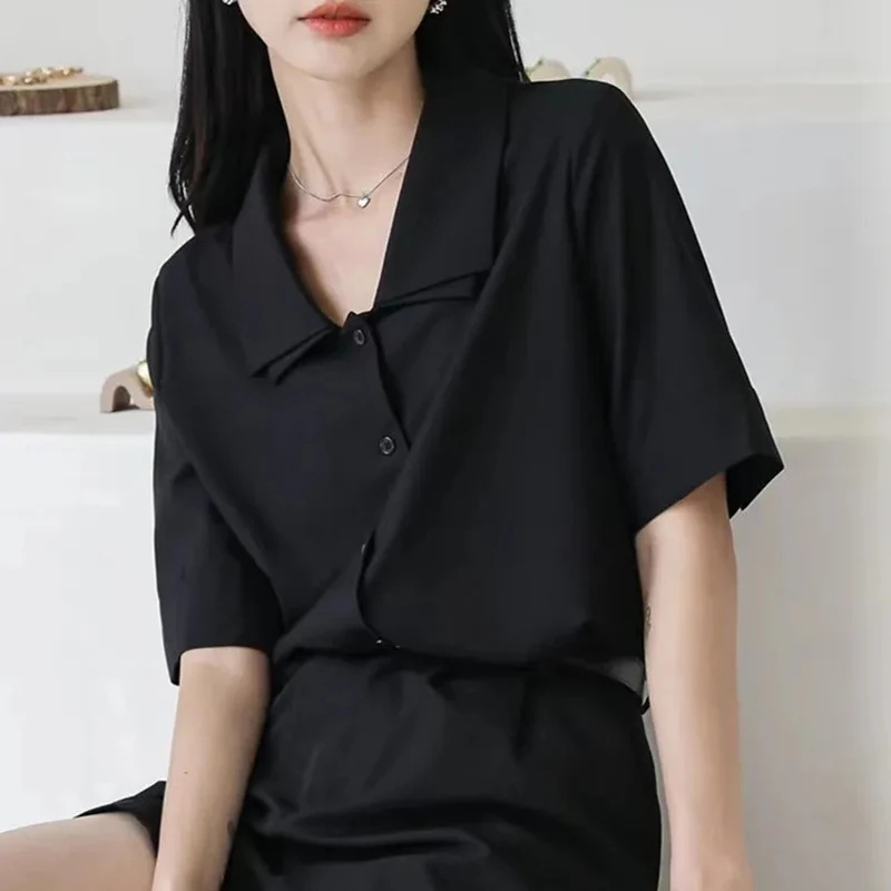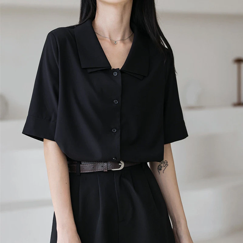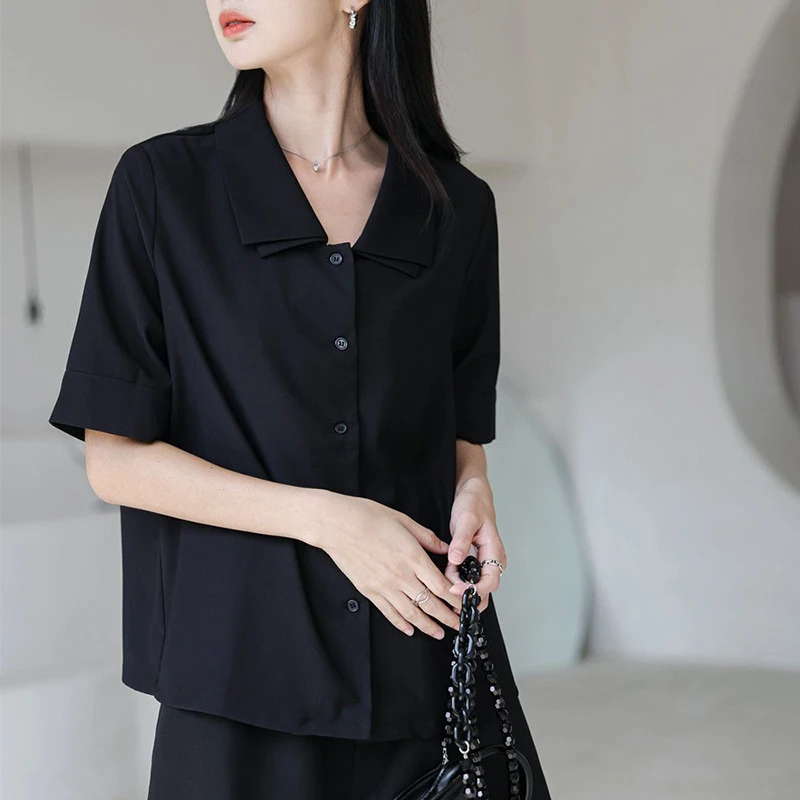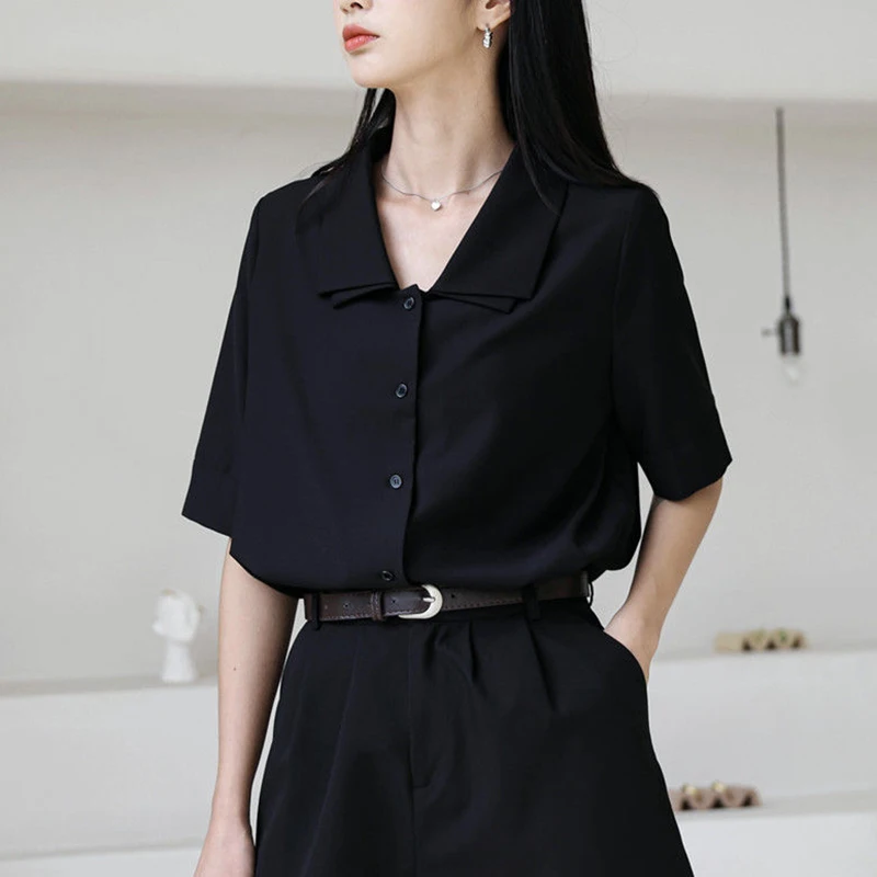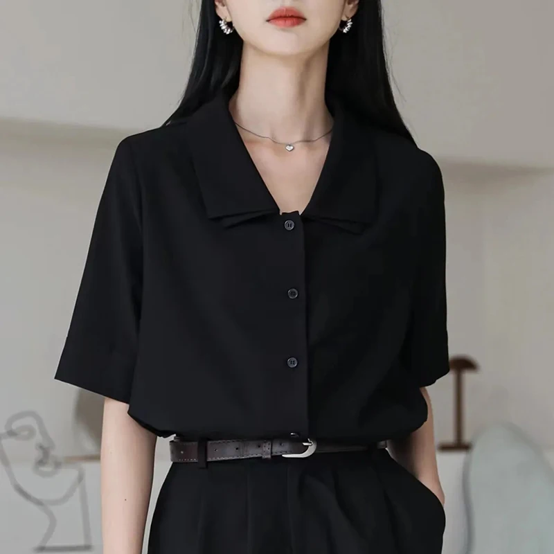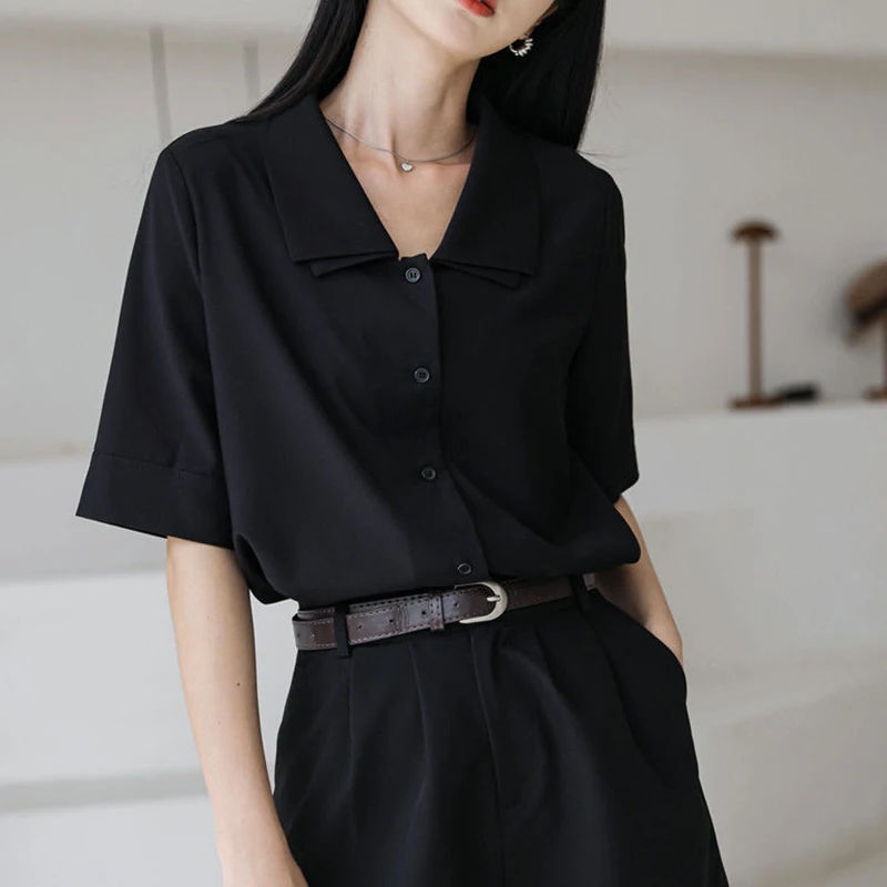 vmtvr Y2K Double Collar Chiffon Shirt Korean Fashion All Match Women Half Sleeve Tops Summer Casual Office Ladies Black Blouse