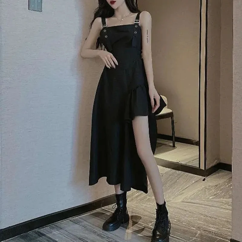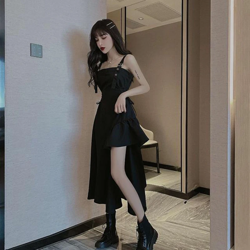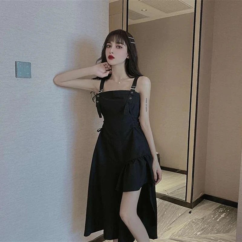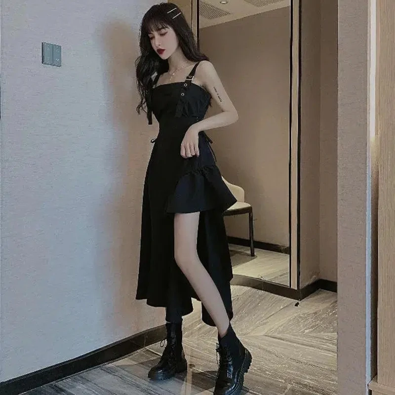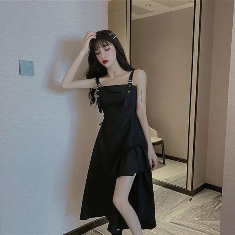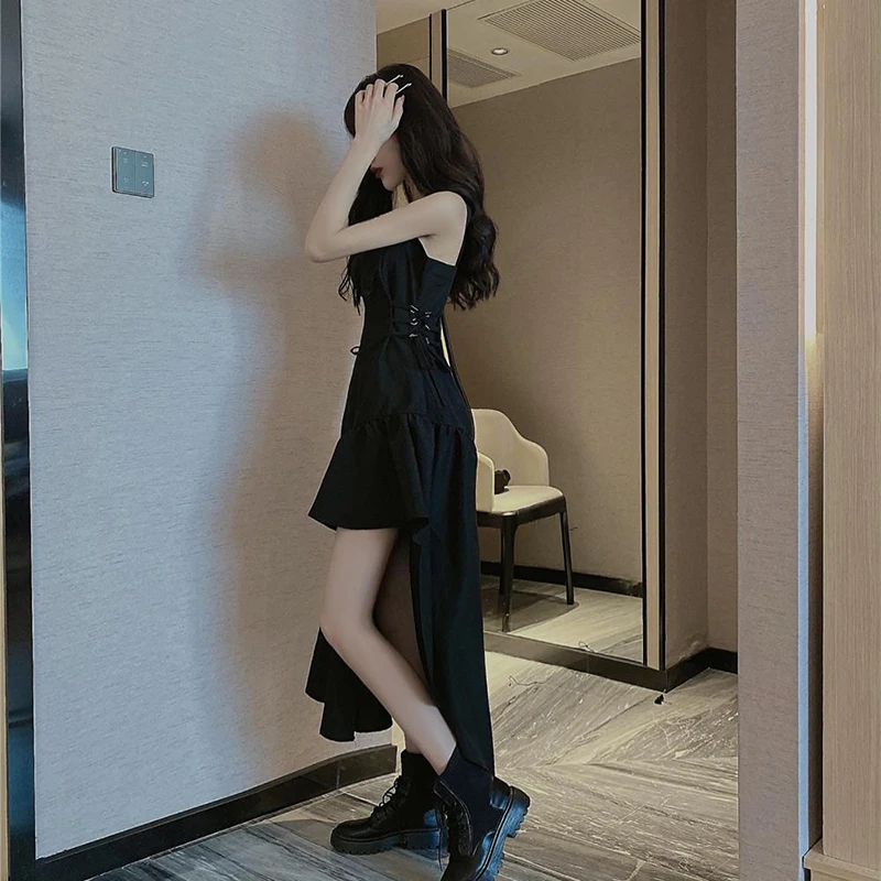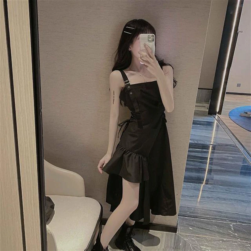 vmtvr Y2K Women Camis Dress Korean Lace-Up Waist Black Dress Summer Fashion Asymmetries Female Ball Gown Dresses New
