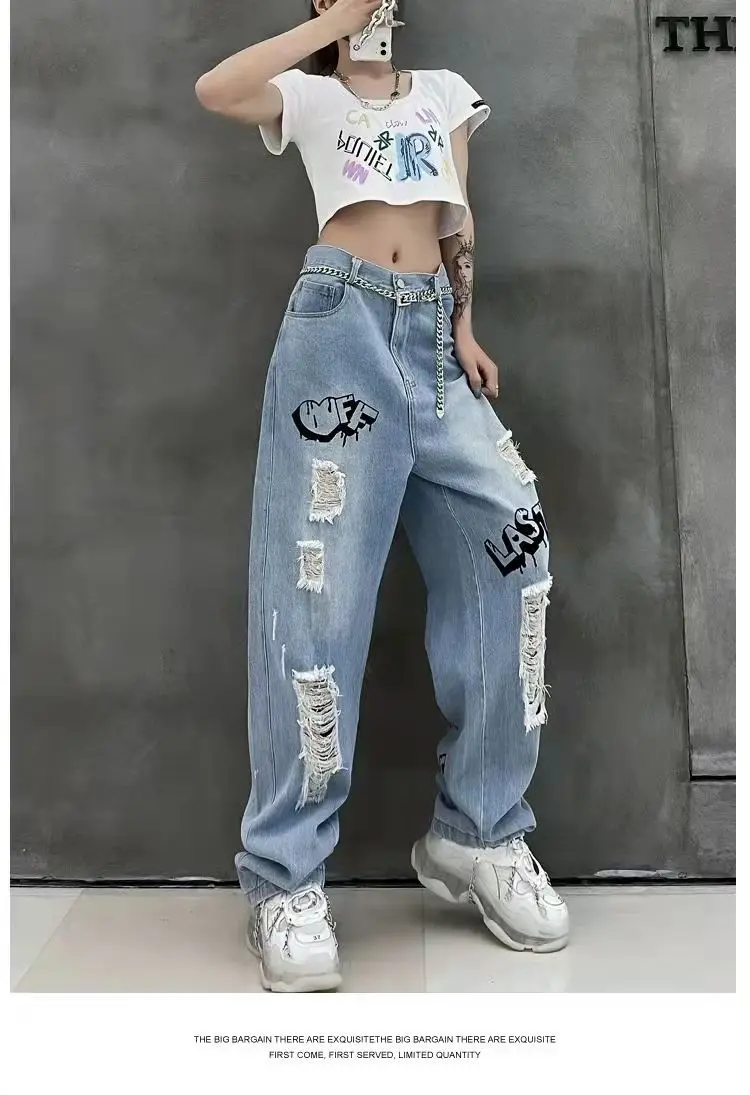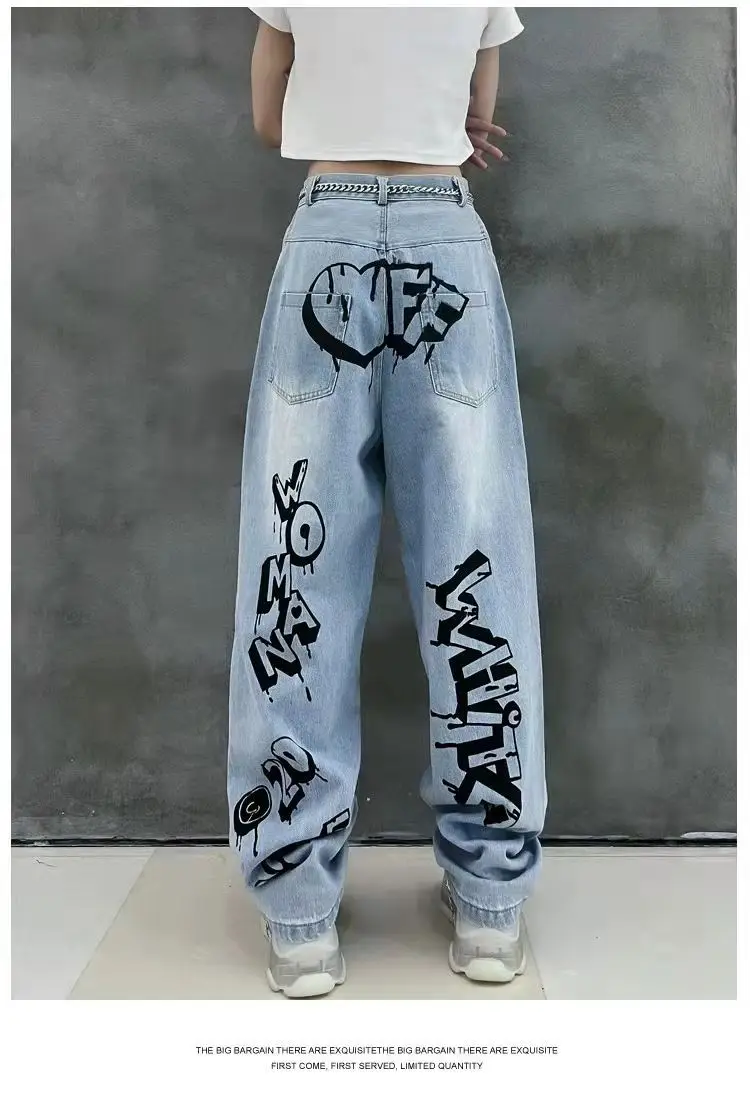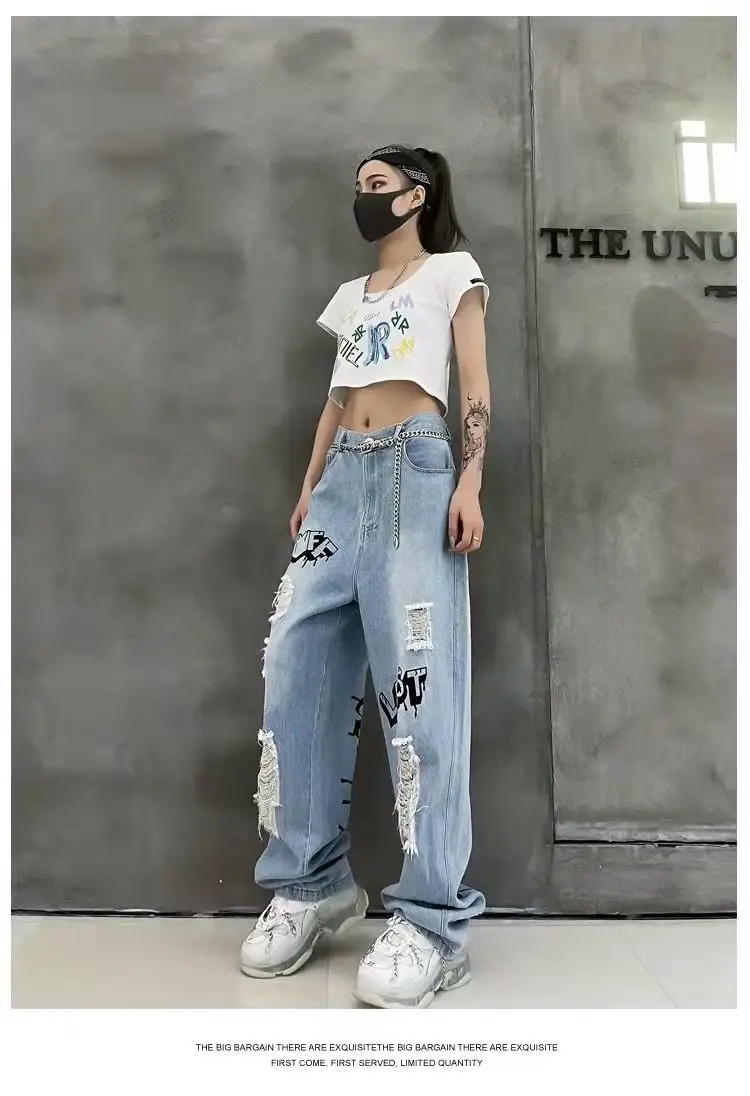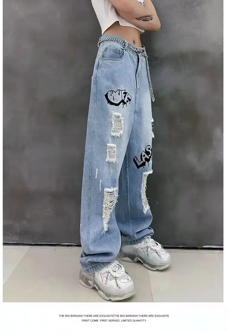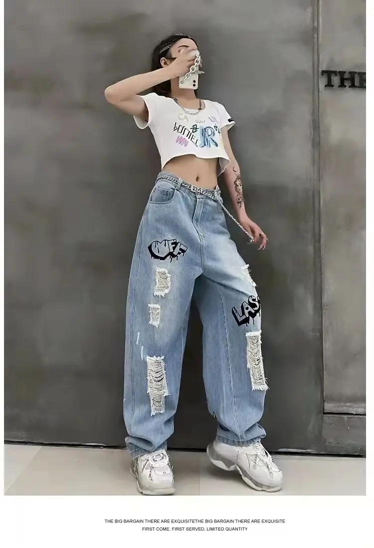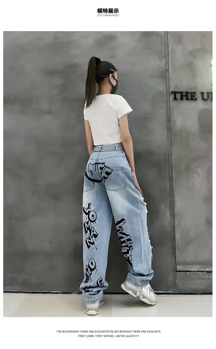 vmtvr Y2k Women Graffiti Hole Wide Leg Jeans Streetwear Fashion Casual Pants Spring Summer New High Waist Loose Vintage Denim Trousers