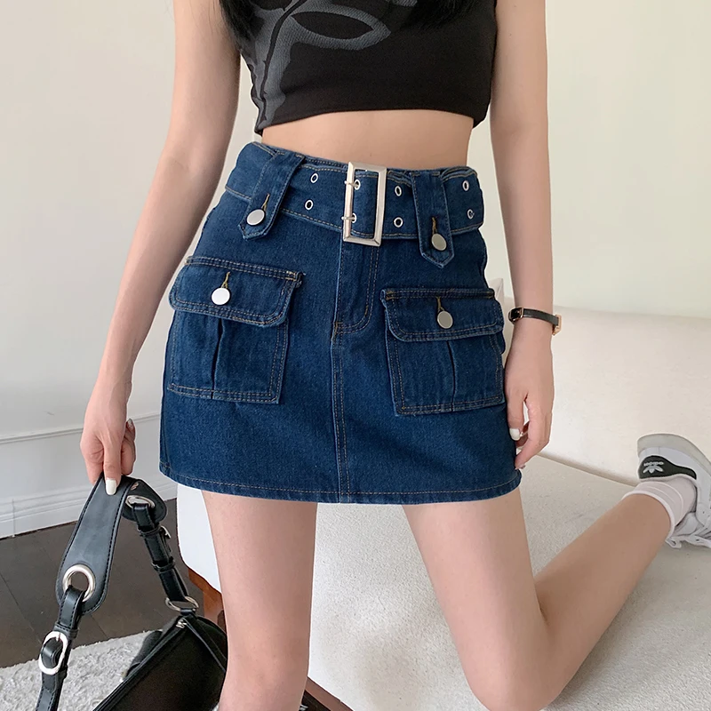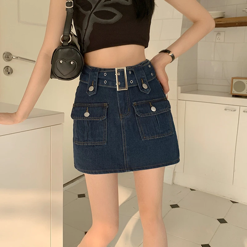 vmtvr Y2K Women High Waist Denim Skirts Korean Retro Belt Mini Skirts Summer Casual Female Streetwear A Line Jeans Skirts
