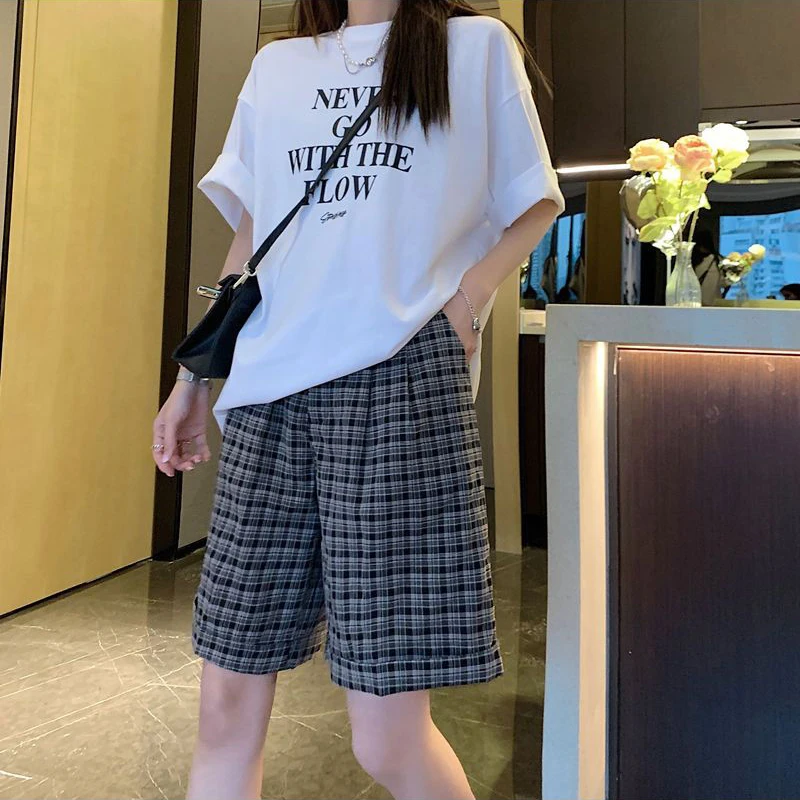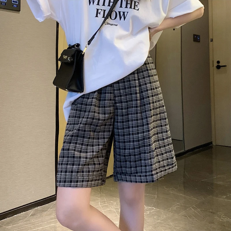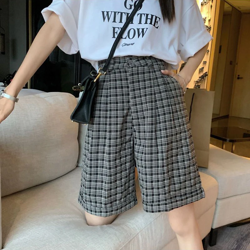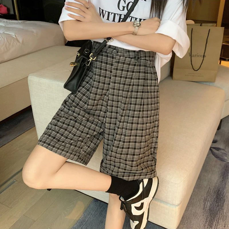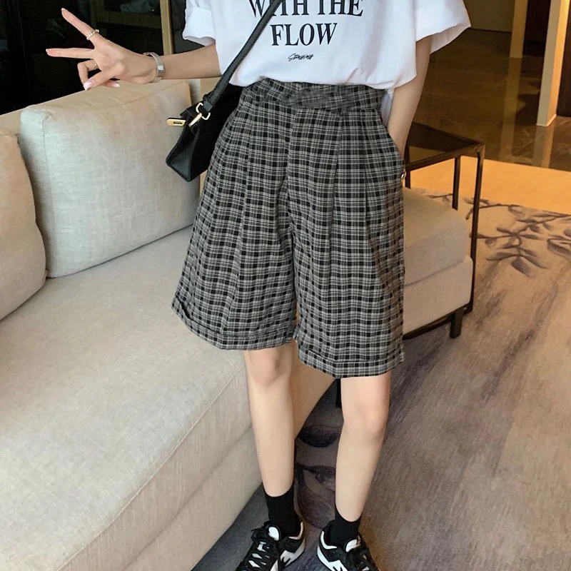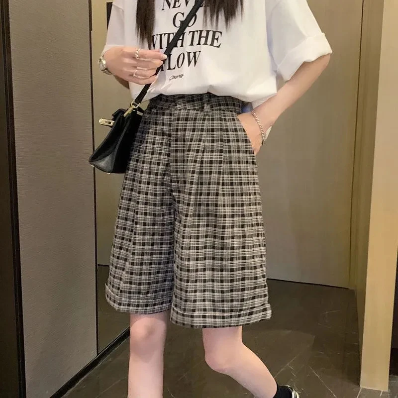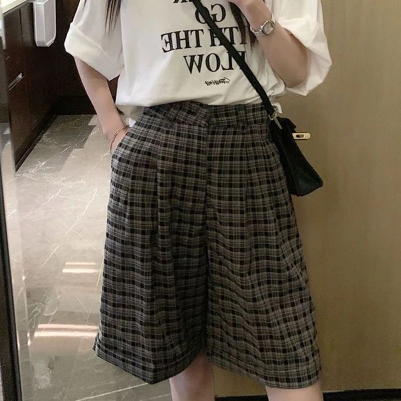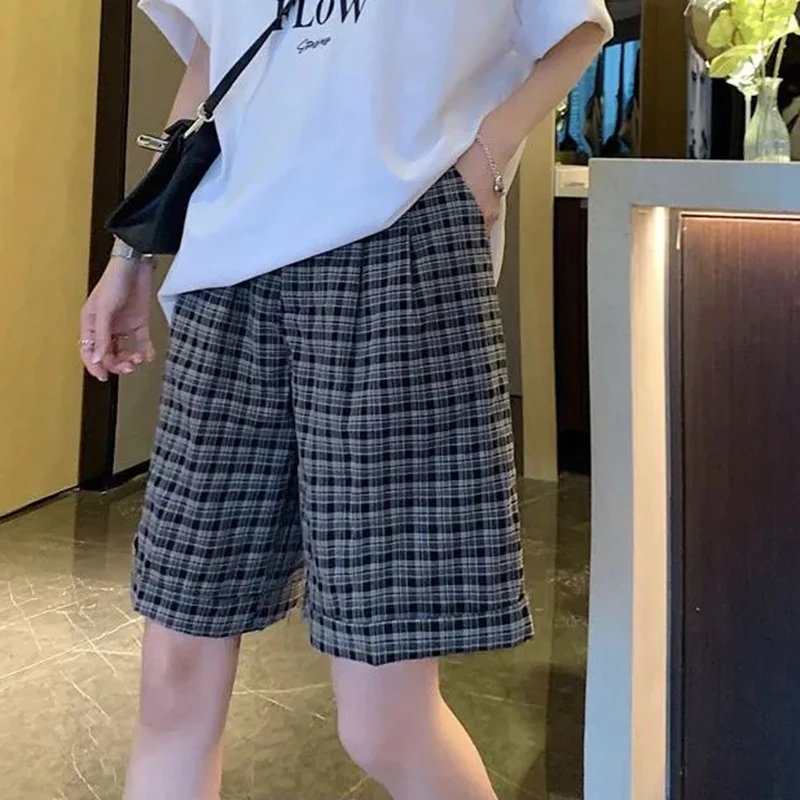 vmtvr Y2K Women Summer Plaid Short Pants Korean Casual Streetwear Loose Straight Leg Pants Fashion Female High Waist Shorts